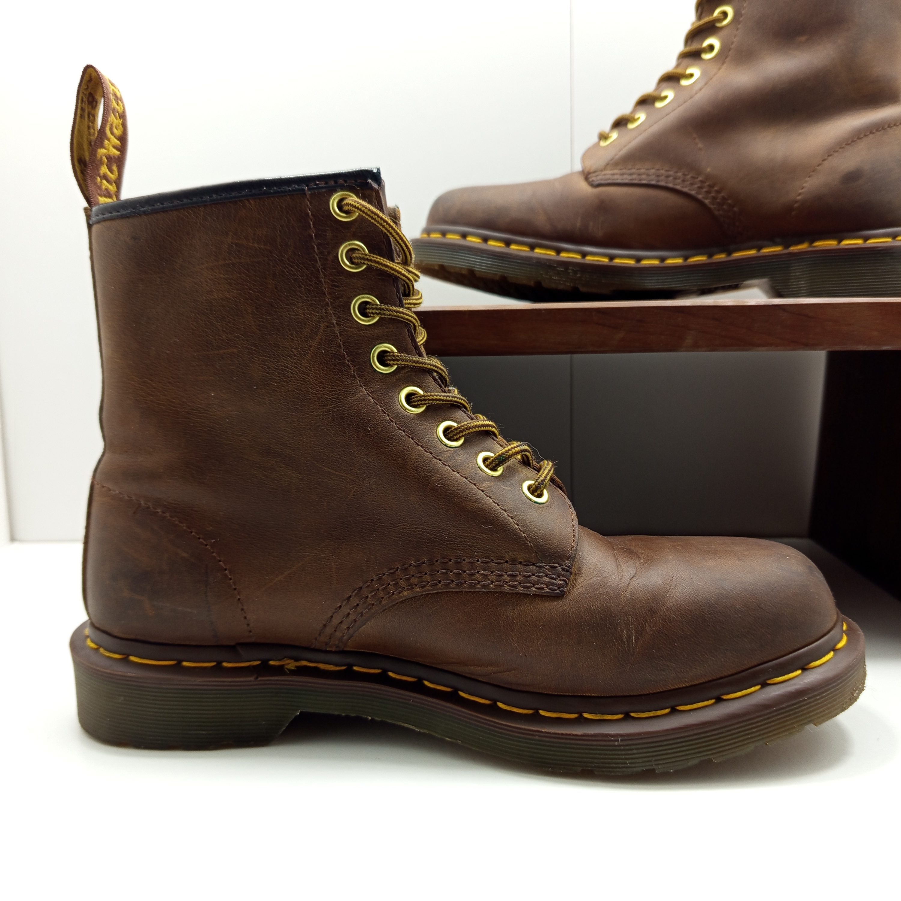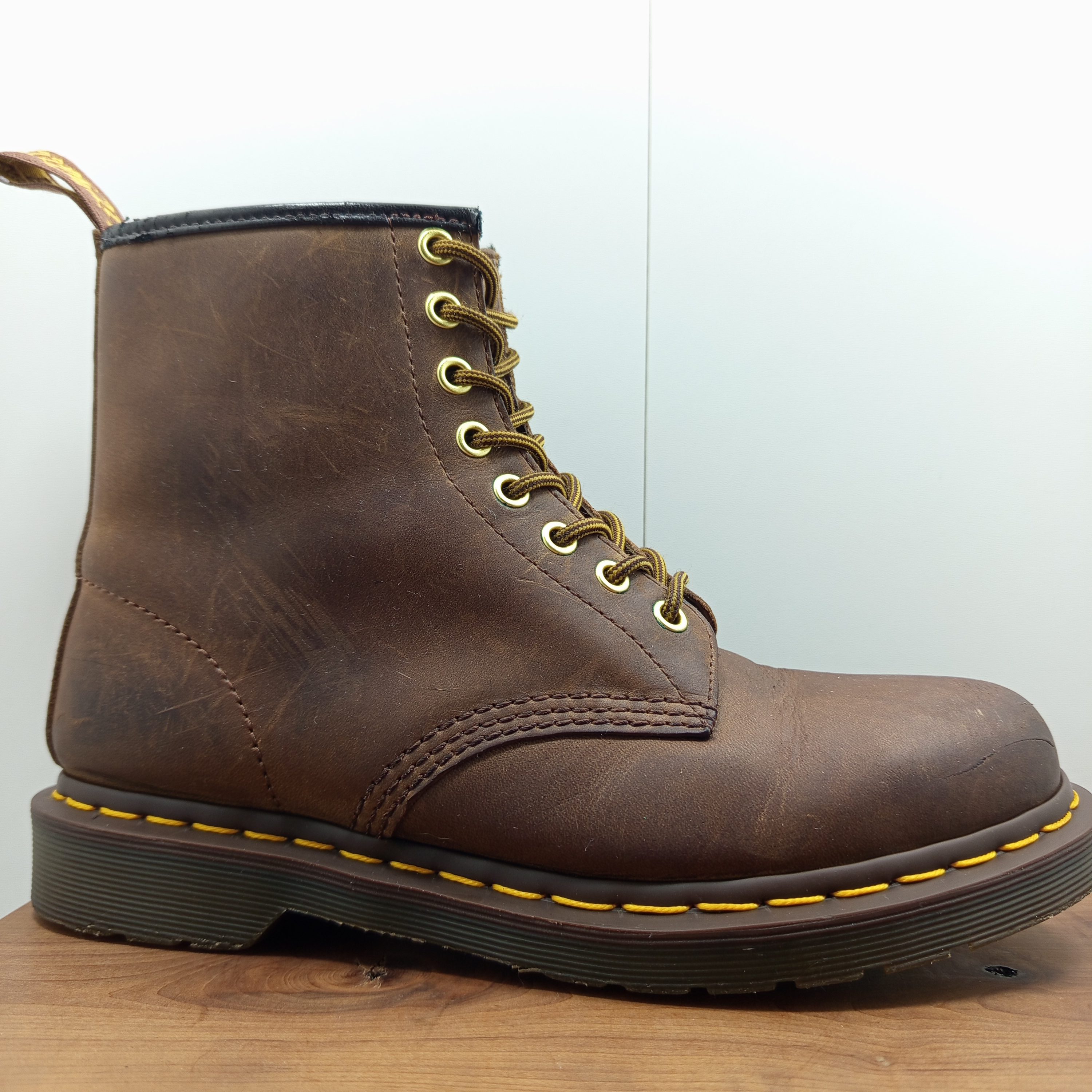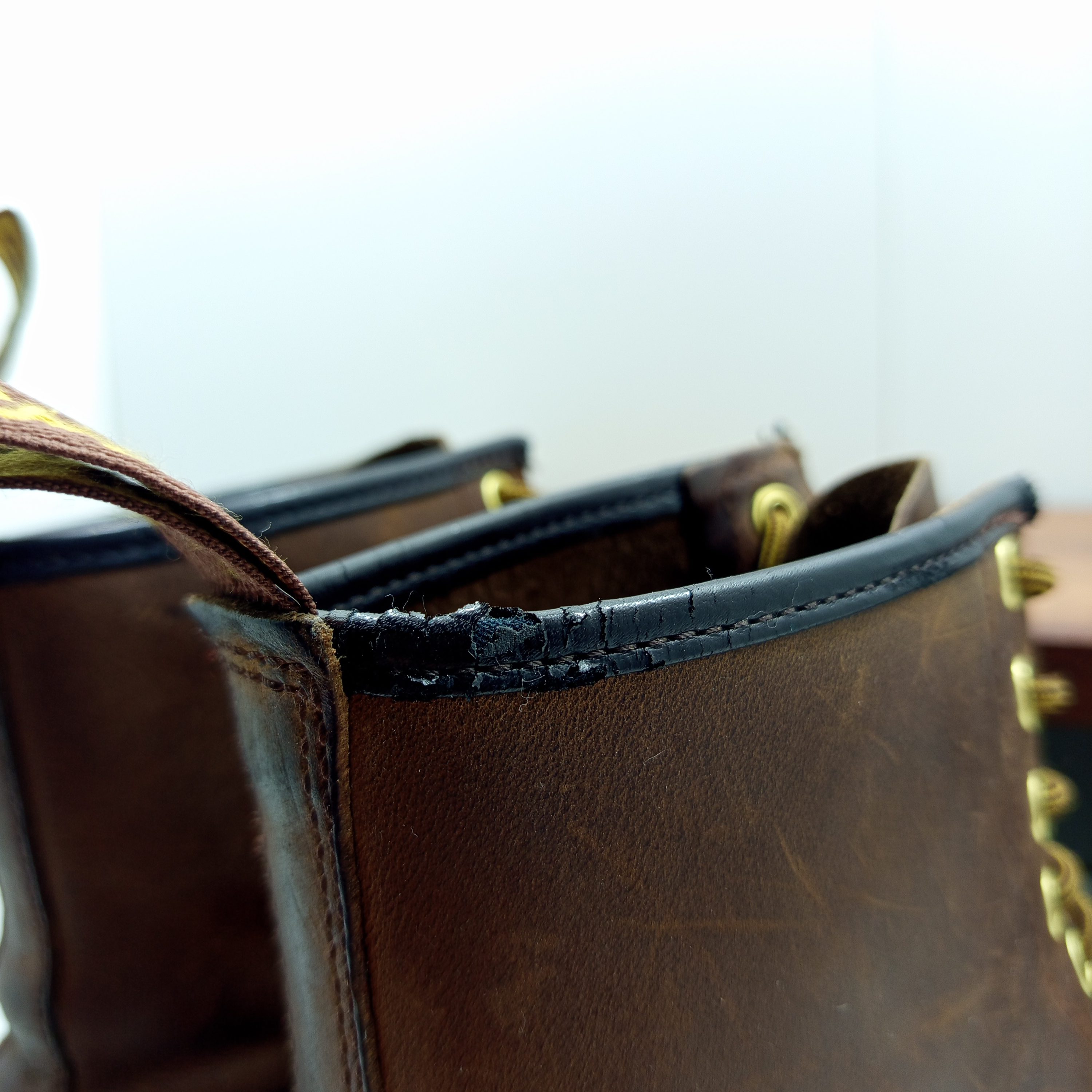 Plusieurs rayures et le tour en cuir en haut des chaussures est abimé.