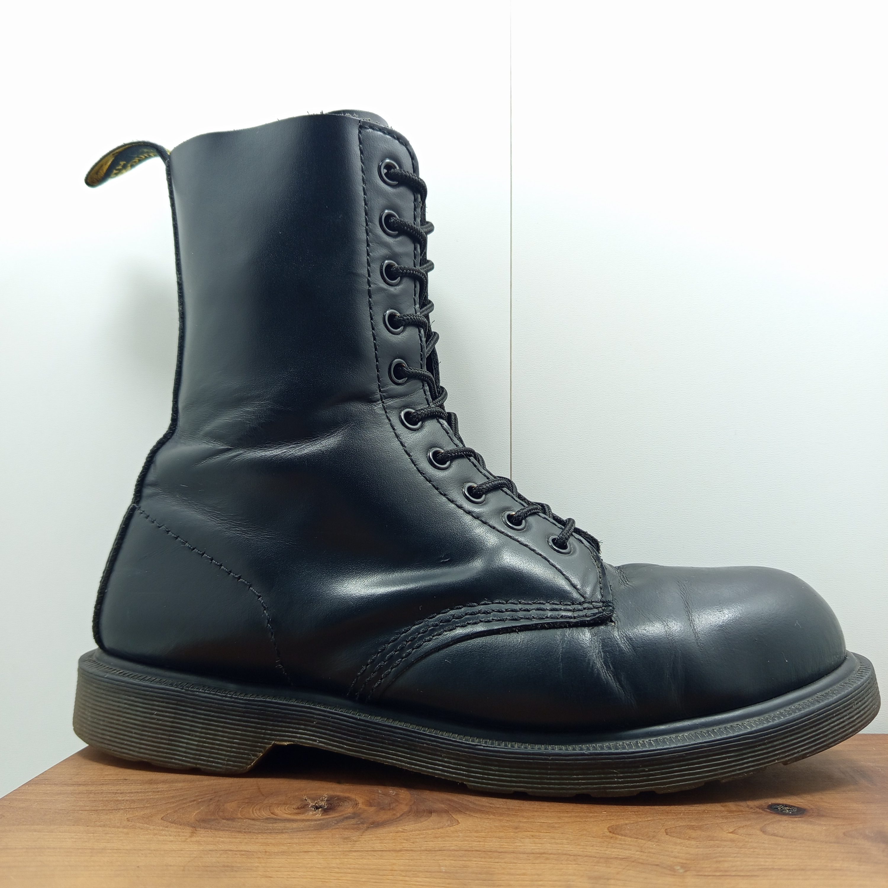 Modèle haut à 10 œillets avec coques en acier, cuir résistant.