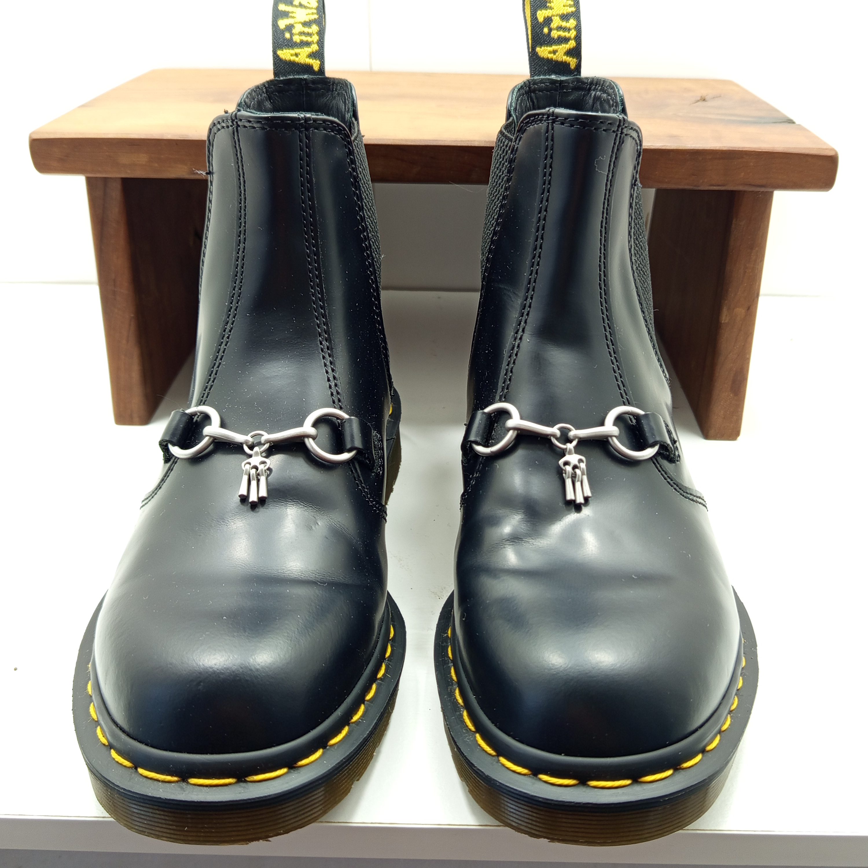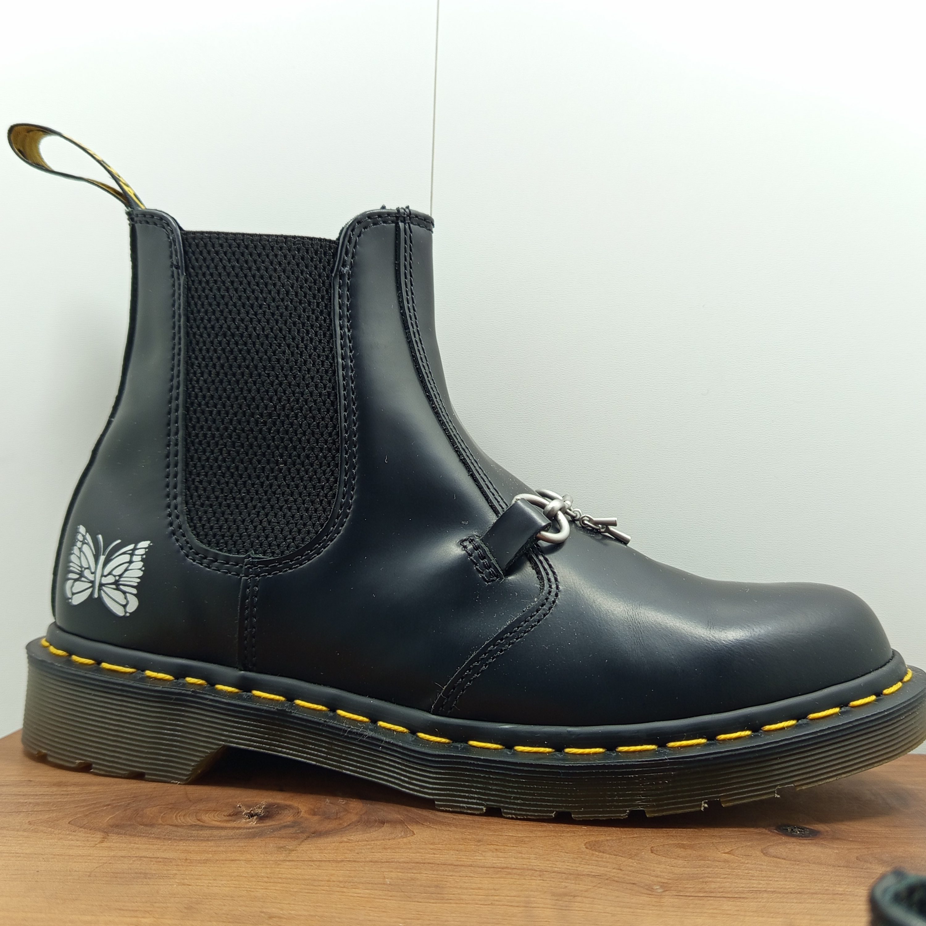 Dr. Martens Chelsea x Needles, édition limitée, fabriquée en Angleterre. Modèle avec élastiques latéraux et logo papillon. Cuir noir lisse de qualité, silhouette classique et détails uniques. Rare en seconde main, parfait pour les fans de la marque.