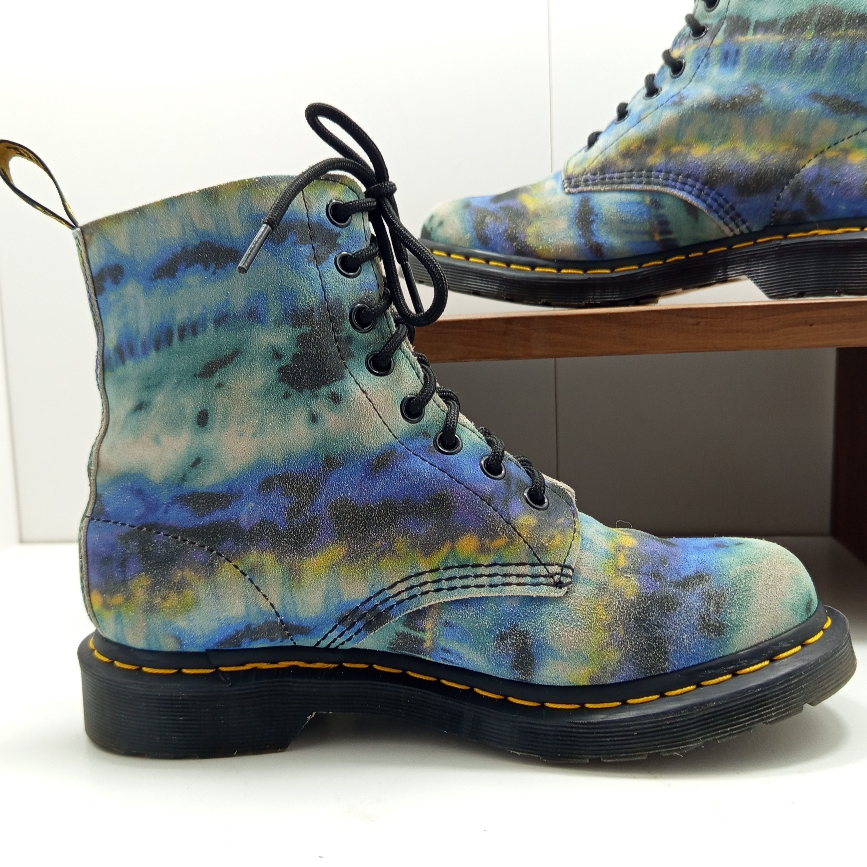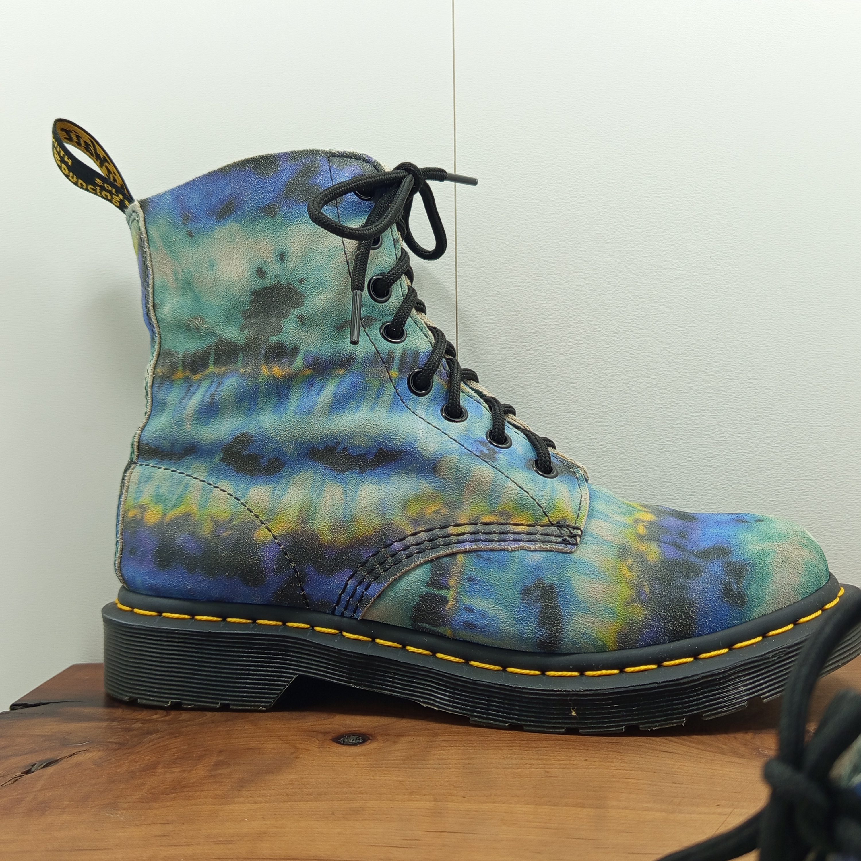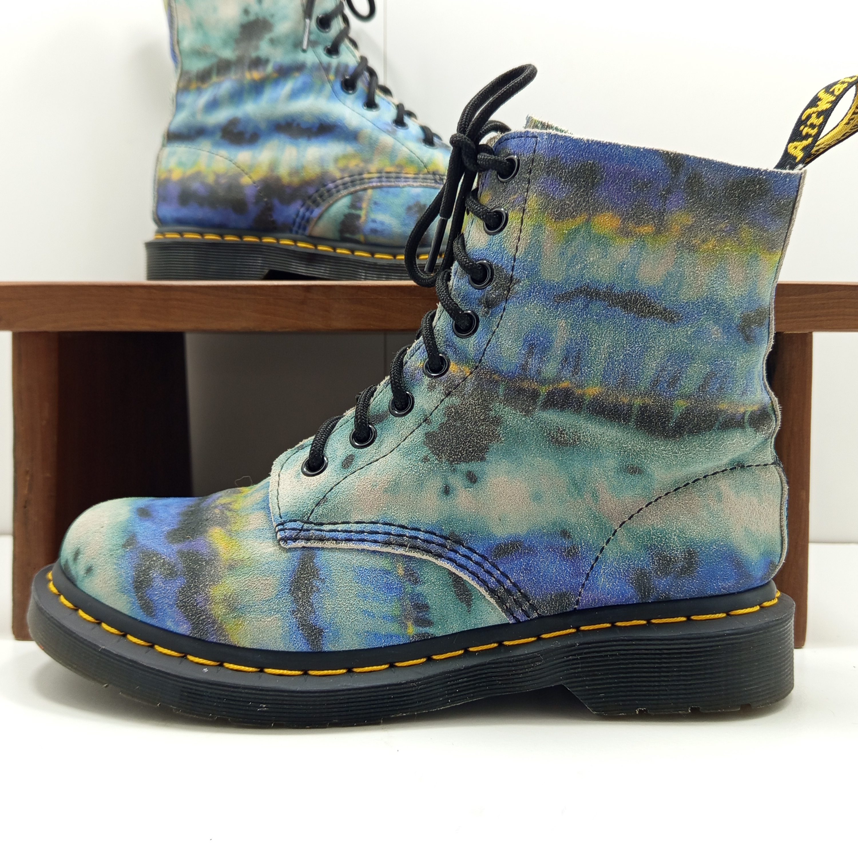 Édition spéciale en cuir souple avec imprimé tie and dye coloré. Modèle 8 œillets iconique, confortable et original.